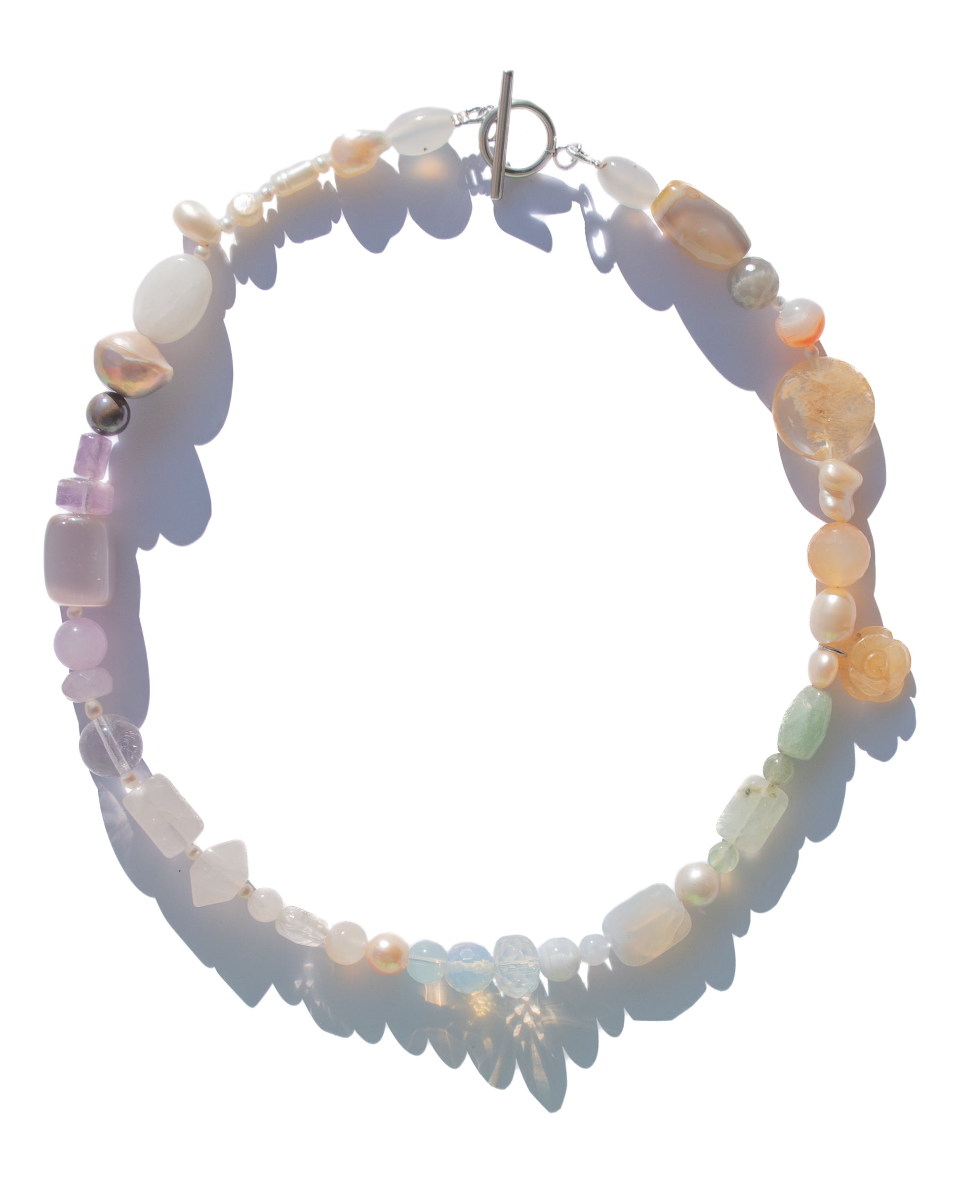 One-of-a-kind necklace. An explosion of soft colors, natural stones, and freshwater pearls, this necklace blends elegance and organic beauty in a harmonious, luminous design.